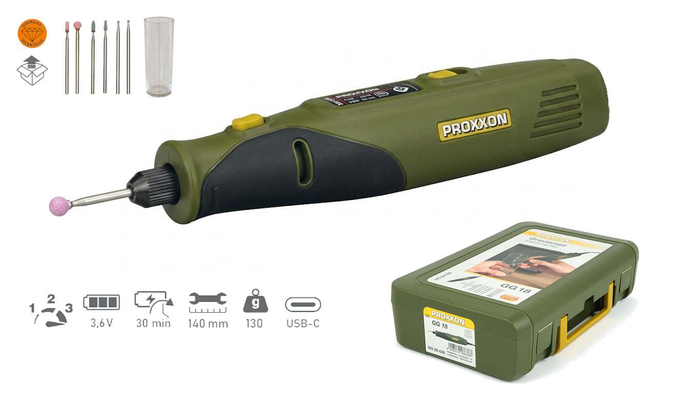 Akkumulátoros modell, USB-C csatlakozóval tölthető! Tartalmazza a kezdő tartozékkészletet és egy „próbaüveget”. Megfelelően tárolva az új MICROMOT dobozban. Sok hasznos tanáccsal és tippel, hogy a gravírozás szórakoztató legyen.