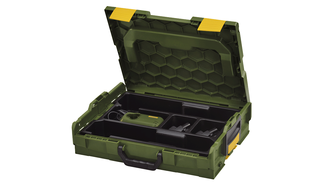 A doboz alkalmas két darab akkumulátoros PROXXON készülék szállítására, tárolására.